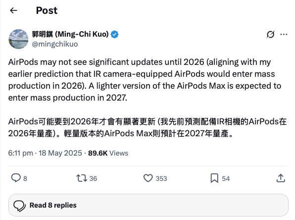 با این حال، ممکن است مدت بیشتری منتظر بمانیم. مینگ چی کو، تحلیلگر، در اردیبهشت ۱۴۰۴ اعلام کرد که ممکن است تا سال ۱۴۰۵ شاهد بهروزرسانی ایرپاد نباشیم. این موضوع میتواند مربوط به تاخیر در تولید به دلیل دوربین مادون قرمز جدیدی باشد که گفته میشود اپل در ایرپادها به کار خواهد برد (جزئیات بیشتر در ادامه).